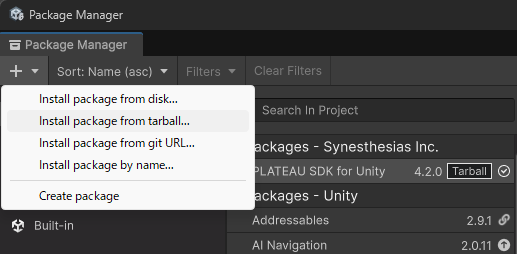 ※ダウンロードデータファイル PLATEAU-SDK-for-Unity-v4.2.0.3.tgz を展開せずに、Unity EditorでWindowメニュー→Packge Management→Package Managerを開いたら、+ボタンから、「Install Package from tarball…」を選択(図) メニューに「PLATEAU」が出ればOK
